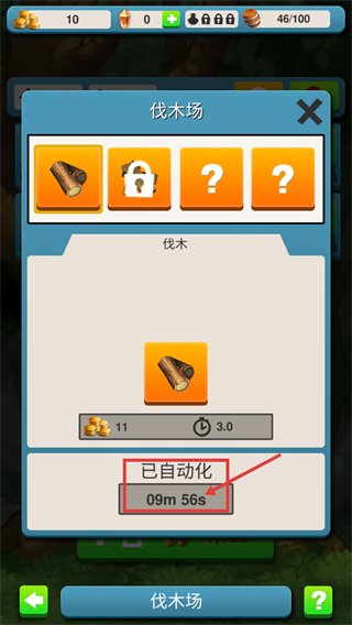 3、伐木场开启【已自动化】后,关注剩余时长【09m56s】,自动化期间持续获取资源。