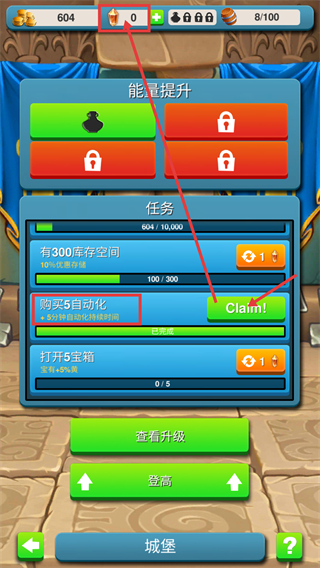 4、完成【购买5自动化】任务后,点击【Claim!】领取奖励,积累资源或提升自动化时长。