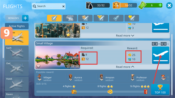 2、执行【Small-Village】航班,消耗【8】油和【12】乘客,可获【25】金币等奖励,点击飞机图标开启飞行。