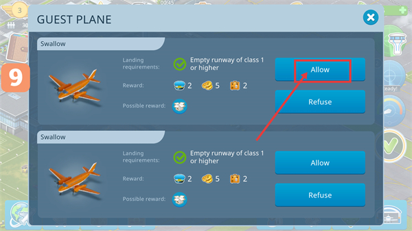 3、在【Guest-Plane】界面点击【Allow】,允许符合条件的飞机降落,获取金币、乘客等奖励。