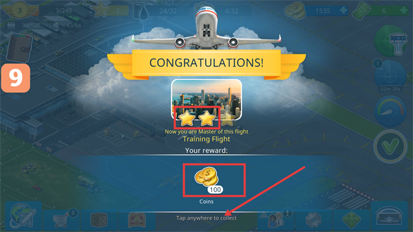 4、完成训练飞行后,出现【CONGRATULATIONS!】提示,点击任意处收集【100】金币奖励,提升游戏进度。