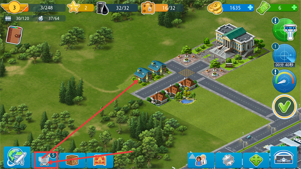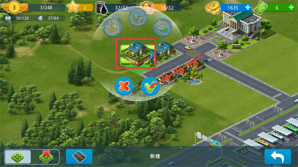 3、在地图上选择合适位置,点击对勾确认放置【侧楼】,完成建筑布局以推动城市建设。