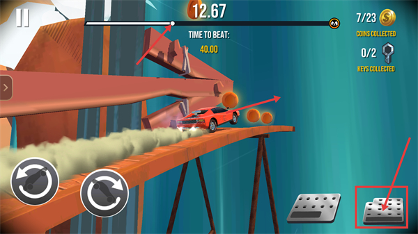 3、在驾驶过程中,关注时间进度,点击加速踏板控制车辆,收集金币和钥匙,顺利通过关卡。