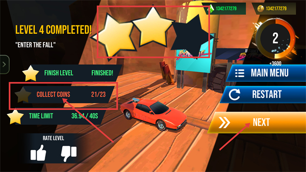 4、完成Level-4后,收集【21/23】金币获两颗星,点击【NEXT】进入下一关,持续推进游戏进度。