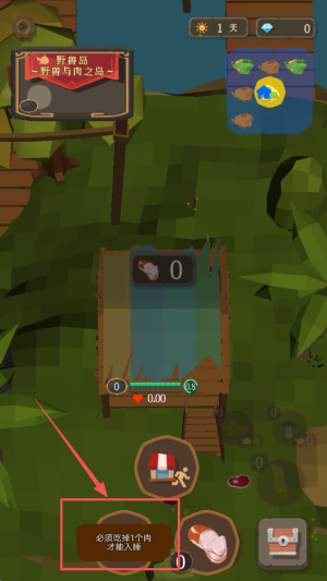 4、开始挑战:在野鲁岛界面查看0.00进度和“必酒吃痒1个肉”提示,收集足够肉类后点击入插开始关卡。