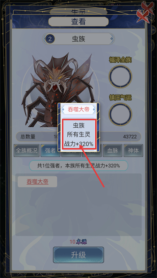 4、解锁强者【吞噬大帝】,让虫族所有生灵战力+320%,大幅提升族群整体战力。