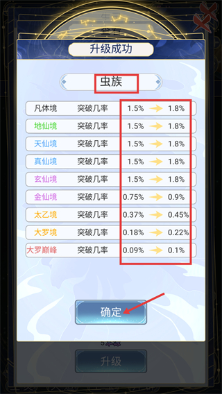 3、升级成功后点击【确定】,使虫族各境界突破几率提升,助力生灵突破更高境界。