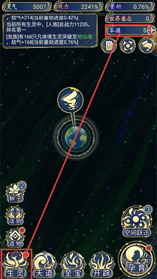 1、关注【本源-5】资源,点击【生灵】按钮,查看族群发展状态,为后续升级奠基。