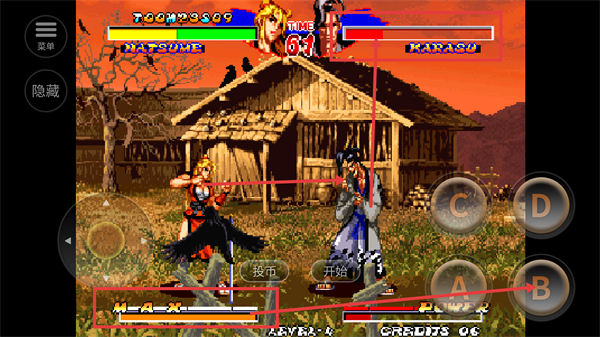 2、战斗时操控角色,结合方向键与【A】【B】【C】【D】键,关注【MAX】条和对手血条调整战术。
