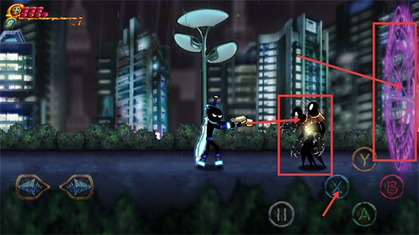 3、攻击恶魔时可使用【X】键切换武器,留意右侧紫色传送门,合理利用场景元素推进战斗。