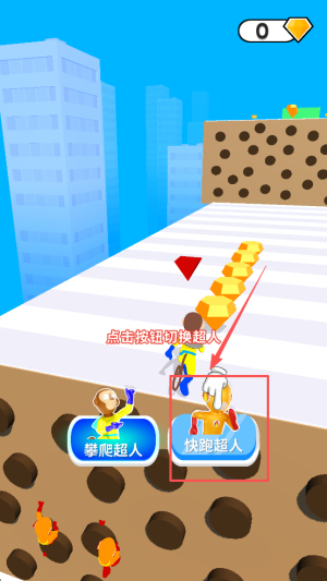 2、选择角色:在角色界面点击按钮切换成“攀爬超人”或“快跑超人”并进入赛道。