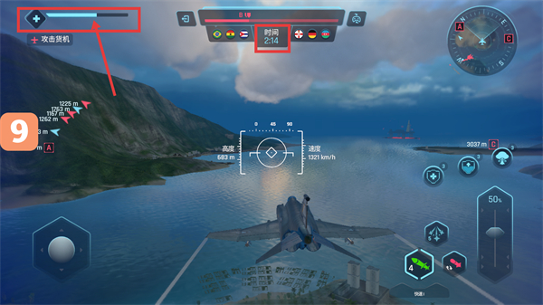 2、通过左侧操作区域控制飞机,依据右上角罗盘【A-B-C】标识瞄准敌人,结合高度-速度数据精准接近目标。