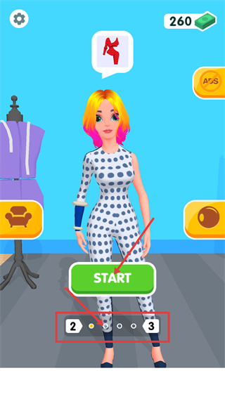 1、点击【START】按钮,开启【2-3】阶段服装改造任务,依据上方服装图标开展设计。