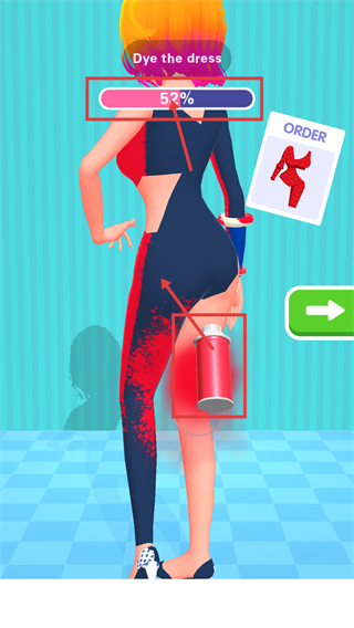 3、关注【进度条-52%】,使用红色喷罐继续染色,完成服装染色任务。