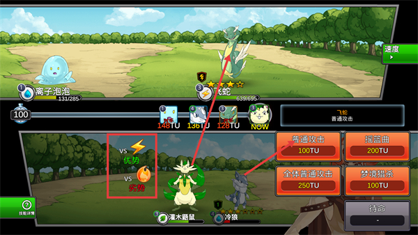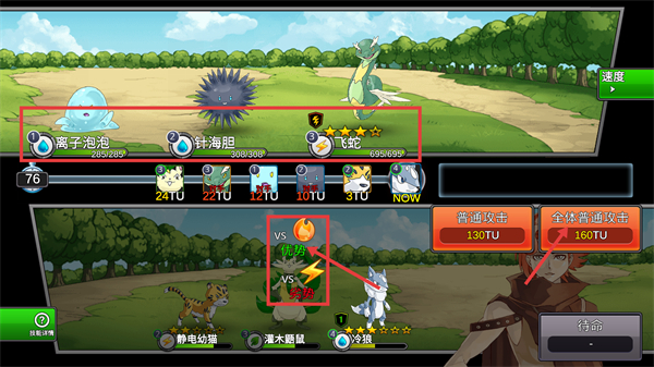 2、战斗中要关注怪兽的TU值和属性克制,如遇到【离子泡泡泡】【针海胆】等怪兽时,合理选择【全体普通攻击-160TU】等攻击方式。