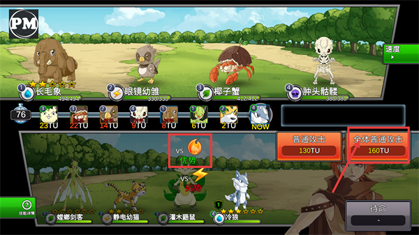 3、战斗中面对【长毛象】【眼镜幼雏】等怪兽,需关注属性克制如【VS-优势】,合理选择【全体普通攻击-160TU】等技能输出。