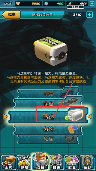 2、改装时选择【马达】位置,马达影响转速、扭力等,扭力越强速度越快,需搭配坠压力零件避免脱轨。