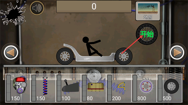 1、点击【开始】,利用发动机、弹簧等零件组装车辆,开启火柴人驾驶挑战。