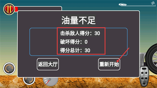 4、油量不足时查看【击杀敌人得分-30】等数据,点击【重新开始】继续挑战,积累得分提升游戏表现。