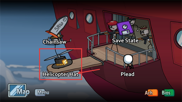 1、在飞艇场景中,获取【HelicopterHat】道具,利用其直升机功能,为后续移动或躲避敌人做准备。