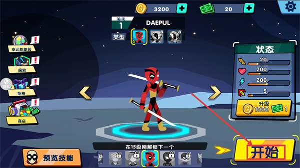 1、点击“开始”按钮进入关卡,可查看角色状态(攻击、血量、能量、暴击等属性),消耗金币或钞票升级属性,提升战力以应对后续挑战。