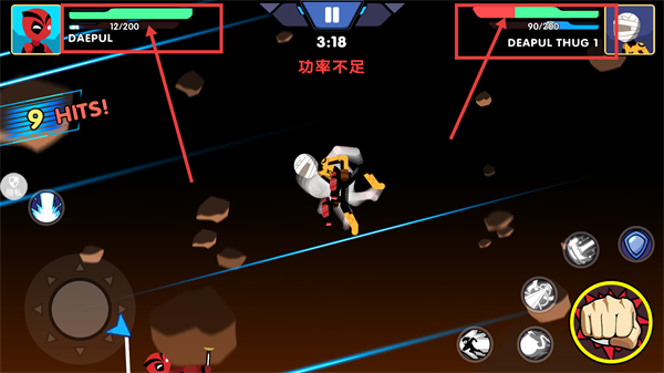 3、密切关注自身血量(绿色条)和敌人血量(红色条),合理走位规避伤害,持续攻击消耗敌人,留意“功率不足”提示,及时调整战斗节奏。
