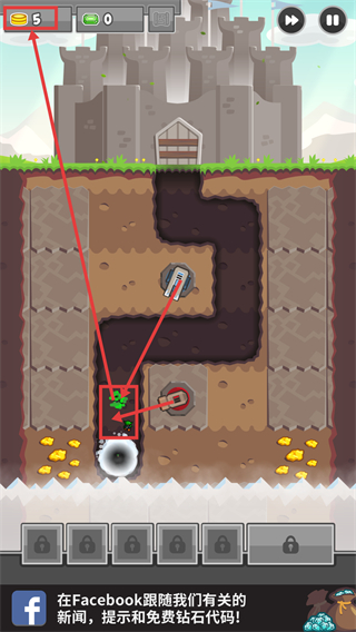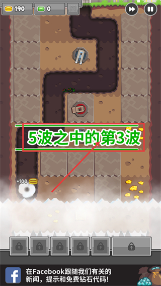 2、关注左上角金币数量,在地下路径中收集金币的同时,抵御绿色敌人的进攻,积累资源为后续塔的建造做准备。