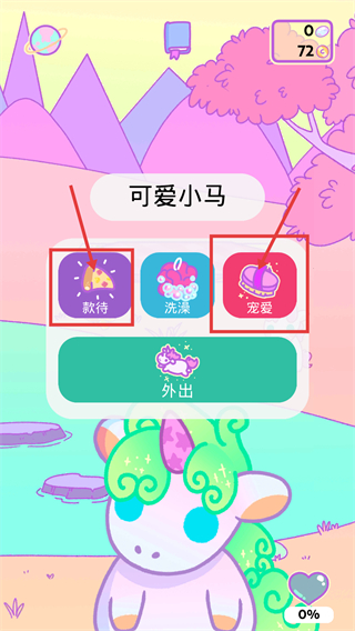 1、针对【可爱小马】,使用【款待】和【宠爱】功能,提升其状态,为后续养成与探索奠定基础。