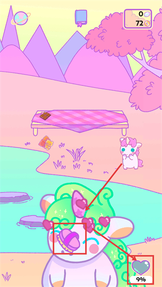 2、对独角兽进行【宠爱】,使其佩戴皇冠,爱心进度提升至【9%】,增强其愉悦度以推动养成进程。