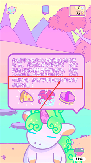 4、关注小偷独角兽的完成度,通过喂养、洗澡等操作使其更快乐,从而可能从旅行中带回更多【金币】和新物品,助力资源积累。