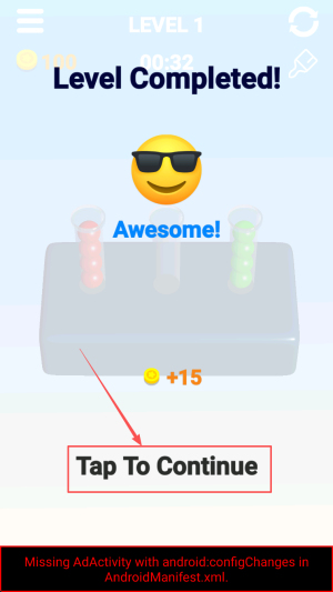 4、完成关卡:在Level Completed界面点击Tap To Continue领取+15奖励并进入下一关。