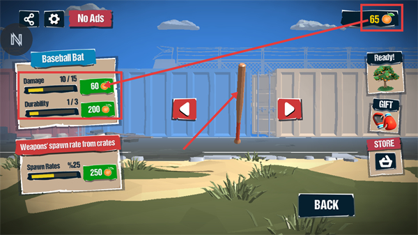 1、使用【橘子-60】升级【Baseball-Bat】的伤害属性,积累资源提升武器战力,为战斗奠定基础。