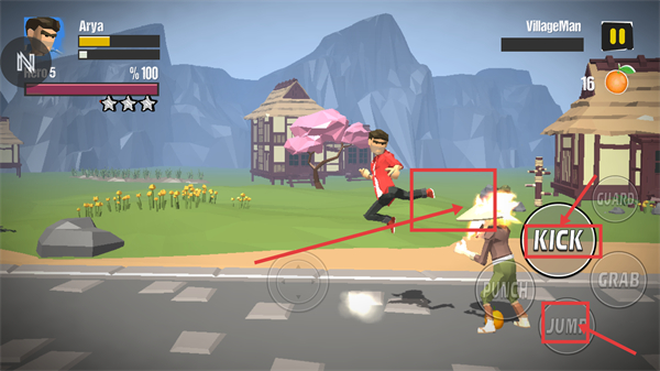 3、结合【KICK】与【JUMP】按键,施展跳跃踢击连招,高效击败敌人并收集资源。