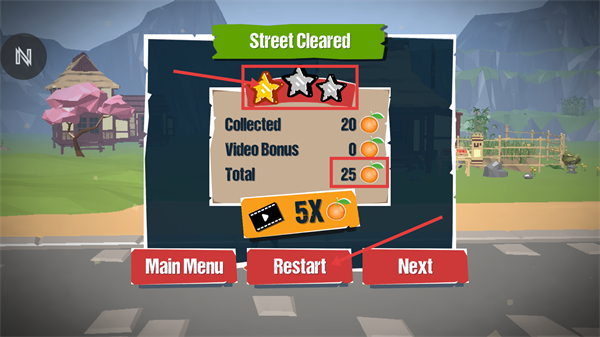 4、通关后获得【橘子-25】奖励,若星级评价不足,可点击【Restart】按钮重玩以提升成绩。