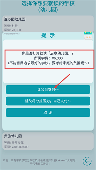 3、在就读提示界面,点击【让父母支付~】,确认就读启卓幼儿园,花费学费¥6000。