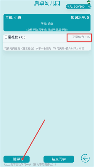4、在启卓幼儿园界面,点击【一键学习】,花费体力15,提升【日常礼仪】水平,收获与学习天赋和投入时间有关。