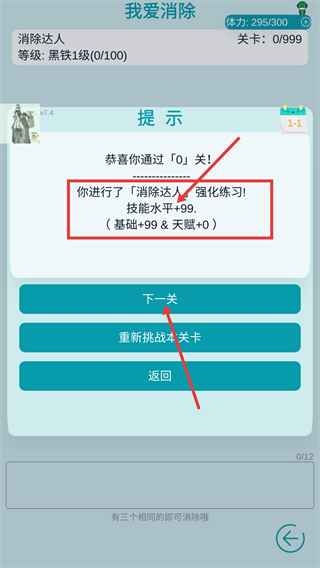 4、通过0关后,完成【消除达人】强化练习,技能水平+99,点击【下一关】继续挑战。