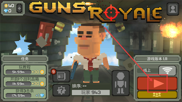 1、点击【Guns-Royale】界面红色播放按钮进入游戏,可查看任务列表,完成任务获取金币奖励。