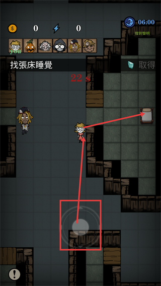 2、执行【找张床睡觉】任务时,操控界面的移动按钮指引角色靠近床,留意【22s】的倒计时,推进该任务的完成进度。