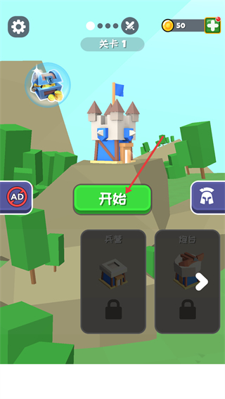 1、进入【关卡1】界面后,点击【开始】按钮开启挑战,当前持有【50】金币,【兵营】-【炮台】暂处于锁定状态需后续推进解锁。