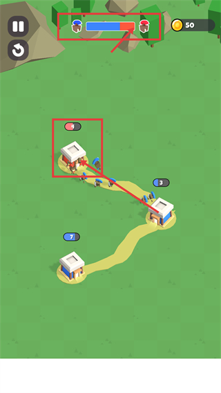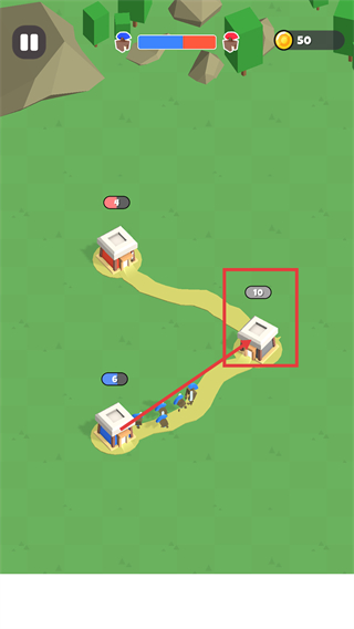 2、对战过程中,优先调配兵力进攻标有【10】的敌方建筑,沿路径推进战线,同时关注上方的对战进度条以掌握局势走向。