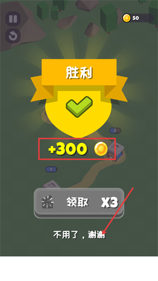 4、关卡胜利后可获得【+300】金币奖励,选择“不用了,谢谢”即可完成结算,积累的资源可用于后续关卡的建筑解锁。