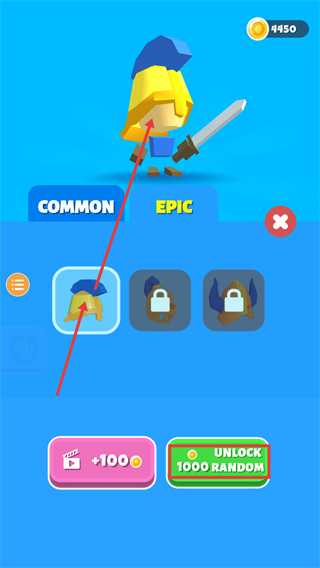 1、在装备界面,可选择【COMMON】品质头盔,消耗【1000】金币点击【UNLOCK-1000-RANDOM】解锁装备。