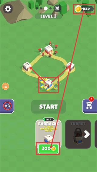 2、进入【LEVEL3】界面,消耗【200】金币解锁【LVL1-BARRACKS】,当前持有【4550】金币,点击【START】按钮开启该关卡挑战。