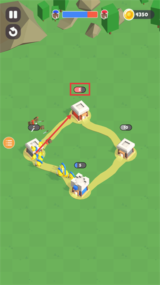 3、对战过程中,集中兵力进攻标有【5】的敌方建筑,沿路径推进战线,同时关注上方进度条把控局势,当前持有【4350】金币。