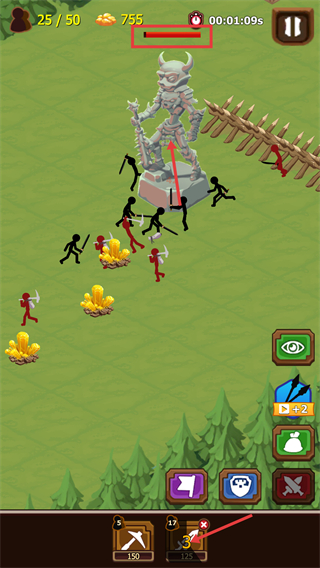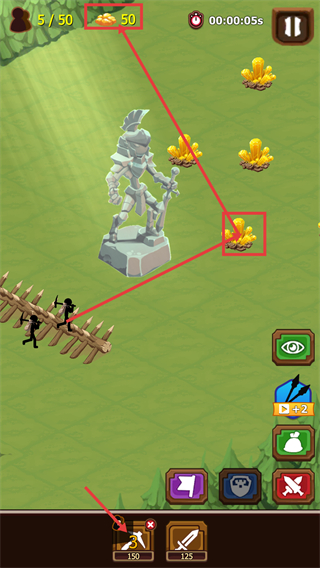 2、战斗中收集【50】类资源,部署成本【150】的兵种,借助雕像区域推进,同时关注【00:00:05s】计时。