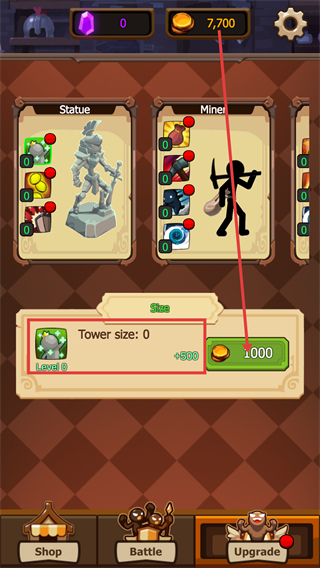 1、在该界面消耗【1000】金币可提升【Tower-size:0】,当前持有【7700】金币,还可查看【Statue】与【Miner】类卡片的养成选项。