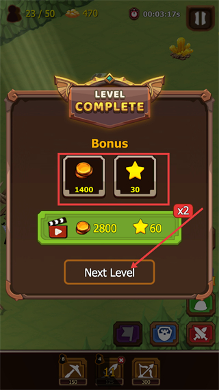 4、关卡完成后获取【1400】金币与【30】星星的【Bonus】,点击【Next-Level】推进关卡,也可看广告获取双倍奖励。