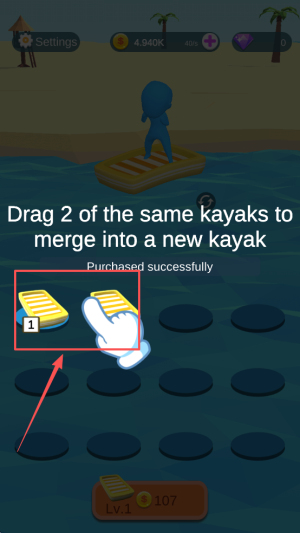 2、合并升级:按提示Drag 2 of the same kayaks to merge,合成新艇确认Purchased successfully。