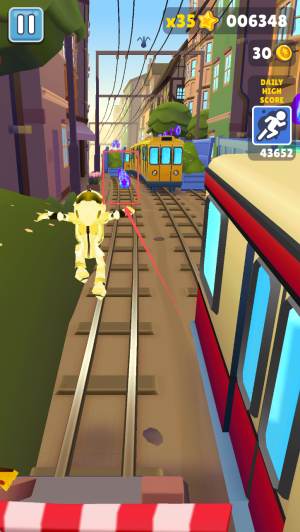 3、游戏进行中:控制角色在铁轨上跑酷,避开障碍物,收集金币和道具,注意火车和障碍物,保持角色存活。
